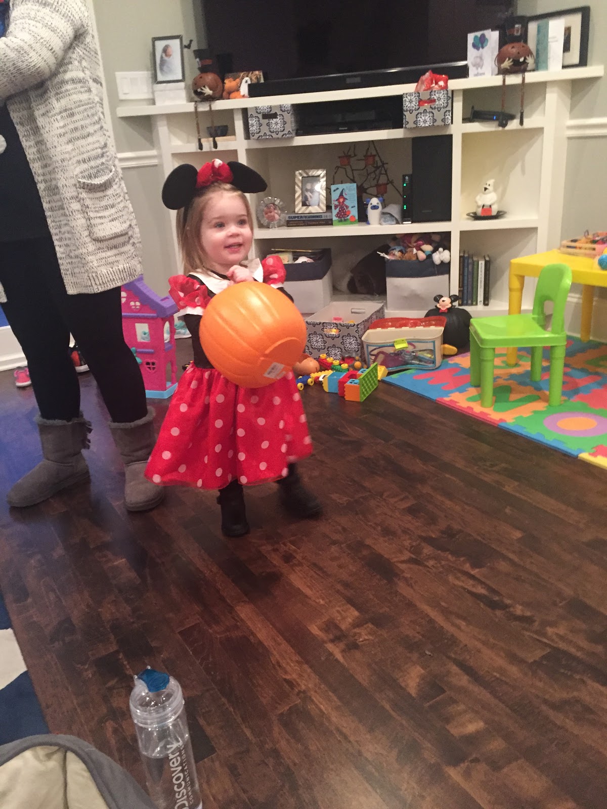 That night we got ready to go Trick or Treating. We weren't sure how Avery would do this year, since she can be shy but we weren't going to let that stop us. She was so excited to be dressed up like Minnie Mouse she was running around the house loving every minute before we left. Nana came down to join us for Trick or Treating - we all wore our Minnie and Mickey ears and went out for over an hour. Avery had so much fun, saying trick or treat and next house. She got the hang of it very quickly... her favorite part was picking out her candy at each house. We let her ride in her car and Gavin was in the stroller that Nana pushed.